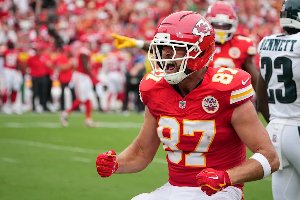 Kansas City Chiefs tight end Travis Kelce is introduced prior to a game against the Cincinnati Bengals at GEHA Field at Arrowhead Stadium on Sept. 15, 2024.