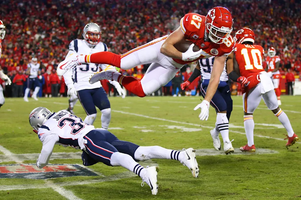 Kansas City Chiefs tight end Travis Kelce leaps over New England Patriots defensive back Jonathan Jones during the first half of the AFC Championship game at Arrowhead Stadium on Jan. 20, 2019.