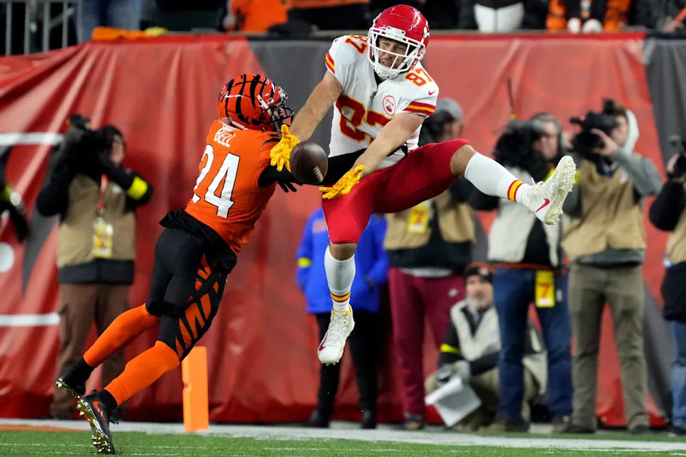 Cincinnati Bengals safety Vonn Bell defends a pass intended for Kansas City Chiefs tight end Travis Kelce in the second quarter of a Week 13 NFL game at Paycor Stadium in Cincinnati on Dec. 4, 2022.