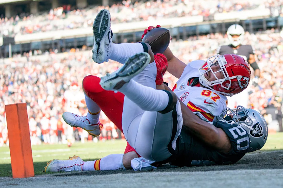 Kansas City Chiefs tight end Travis Kelce scores a touchdown against Oakland Raiders cornerback Daryl Worley (20) during the first quarter at Oakland Coliseum on Dec. 2, 2018.