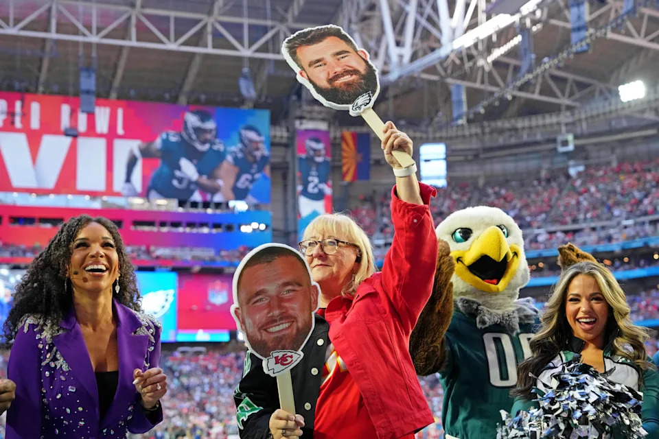 Donna Kelce, mother to Kansas City Chiefs tight end Travis Kelce (not pictured) and Philadelphia Eagles center Jason Kelce (not pictured), holds up a picture of her son Jason before Super Bowl LVII at State Farm Stadium in Glendale, Ariz. on Feb. 12, 2023.