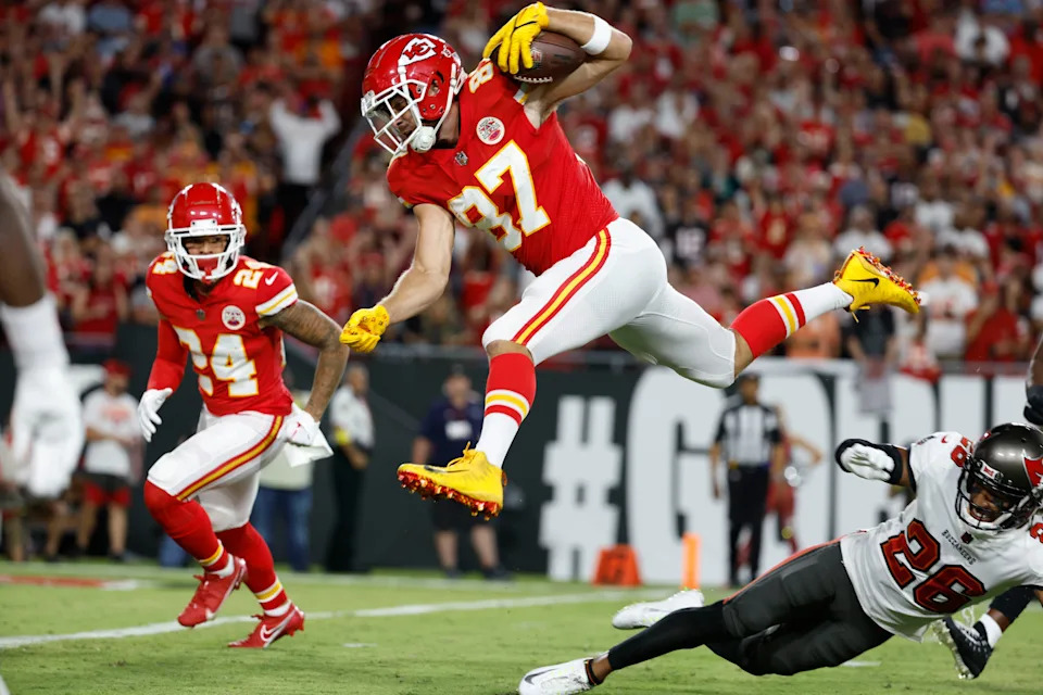 Kansas City Chiefs tight end Travis Kelce runs the ball in for a touchdown against the Tampa Bay Buccaneers during the first quarter at Raymond James Stadium in Tampa, Fla. on Oct. 2, 2022