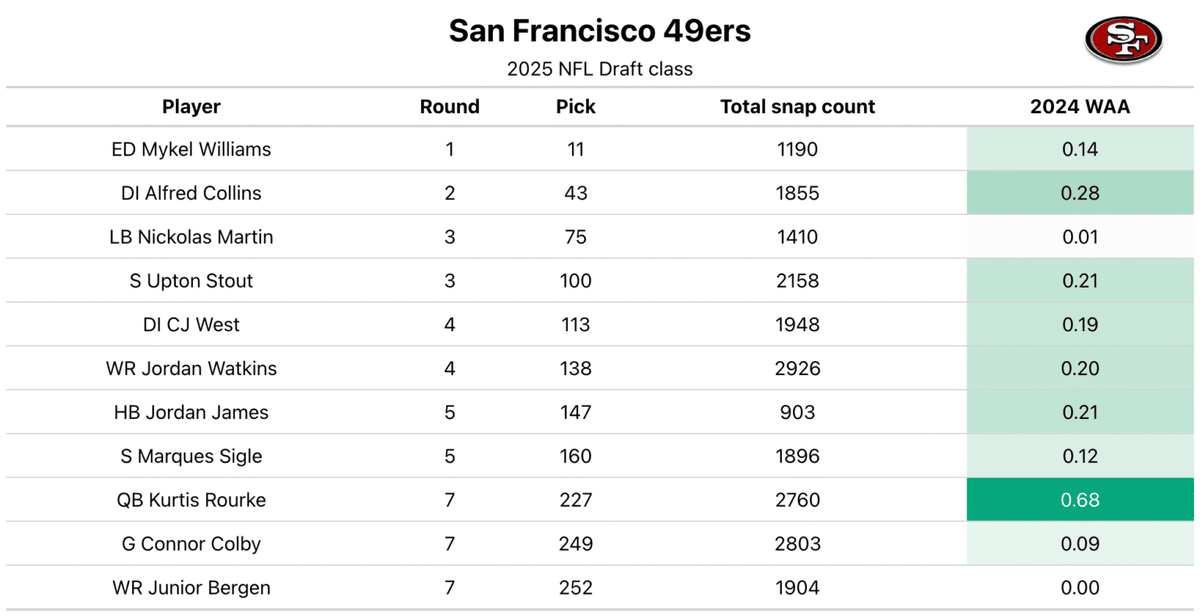 Pro Football Focus ranked each draft class by snap counts to see which teams came away with the most experienced class. The 49ers came away with the fourth-most snaps with 21,753 — likely aided by the number of draft picks they had.