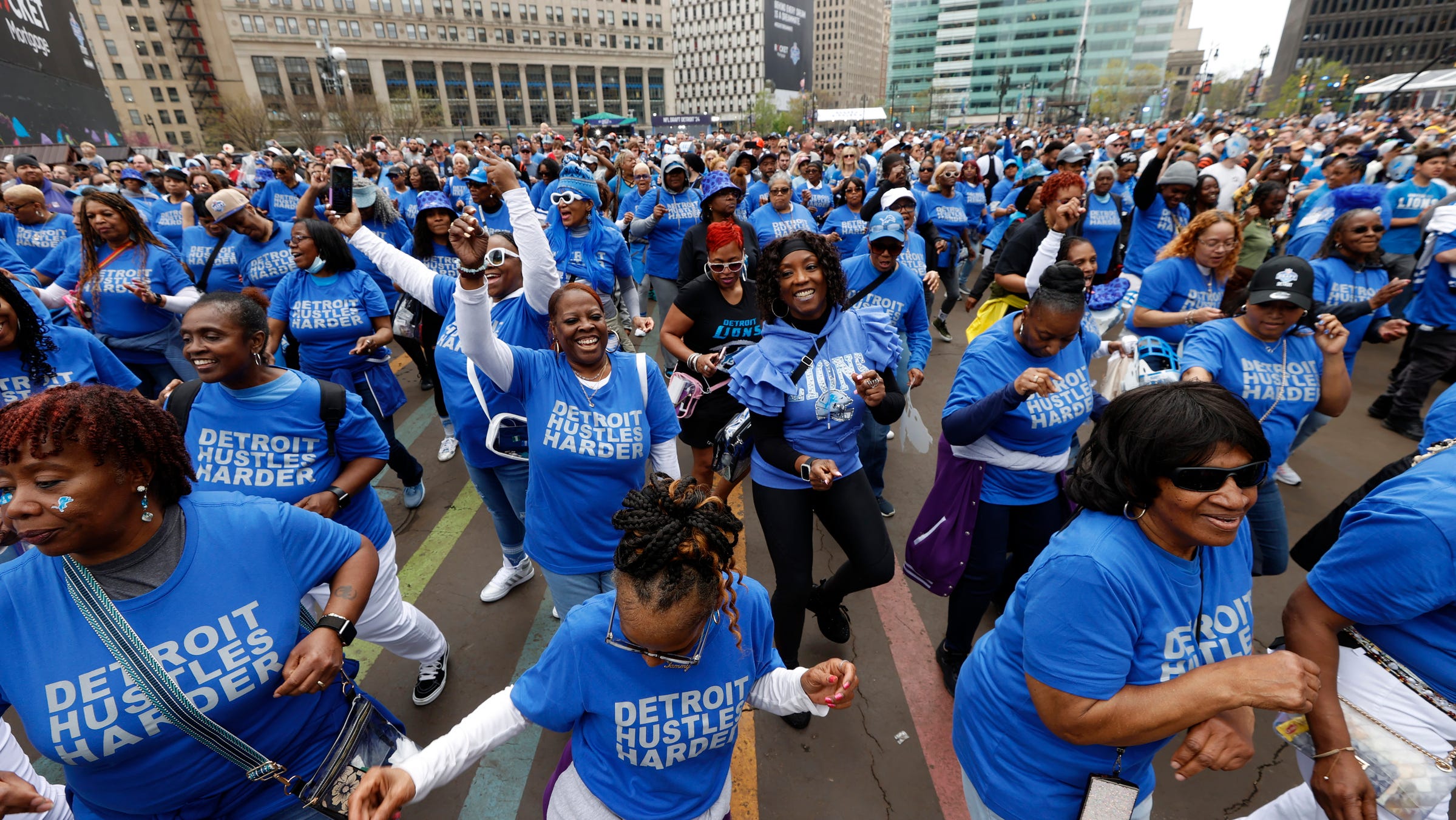 More than 100 people joined together to do the hustle in front of the NFL draft theater between rounds 4-7 at the 2024 NFL draft in Detroit on Saturday April 27, 2024.