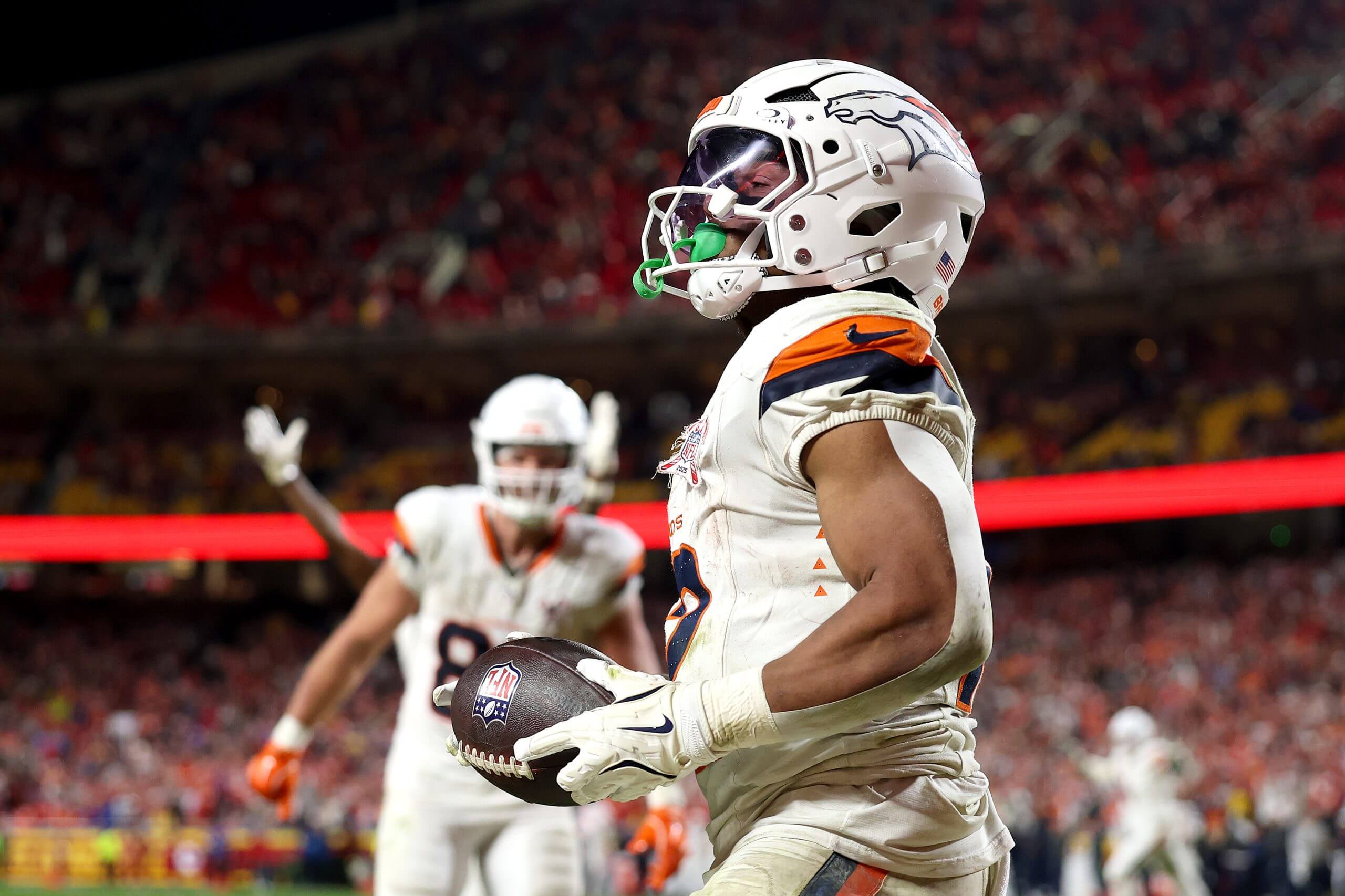 RJ Harvey reacts after his fourth-quarter touchdown catch gave the Broncos the lead for good on Thursday. (Jamie Squire / Getty Images)