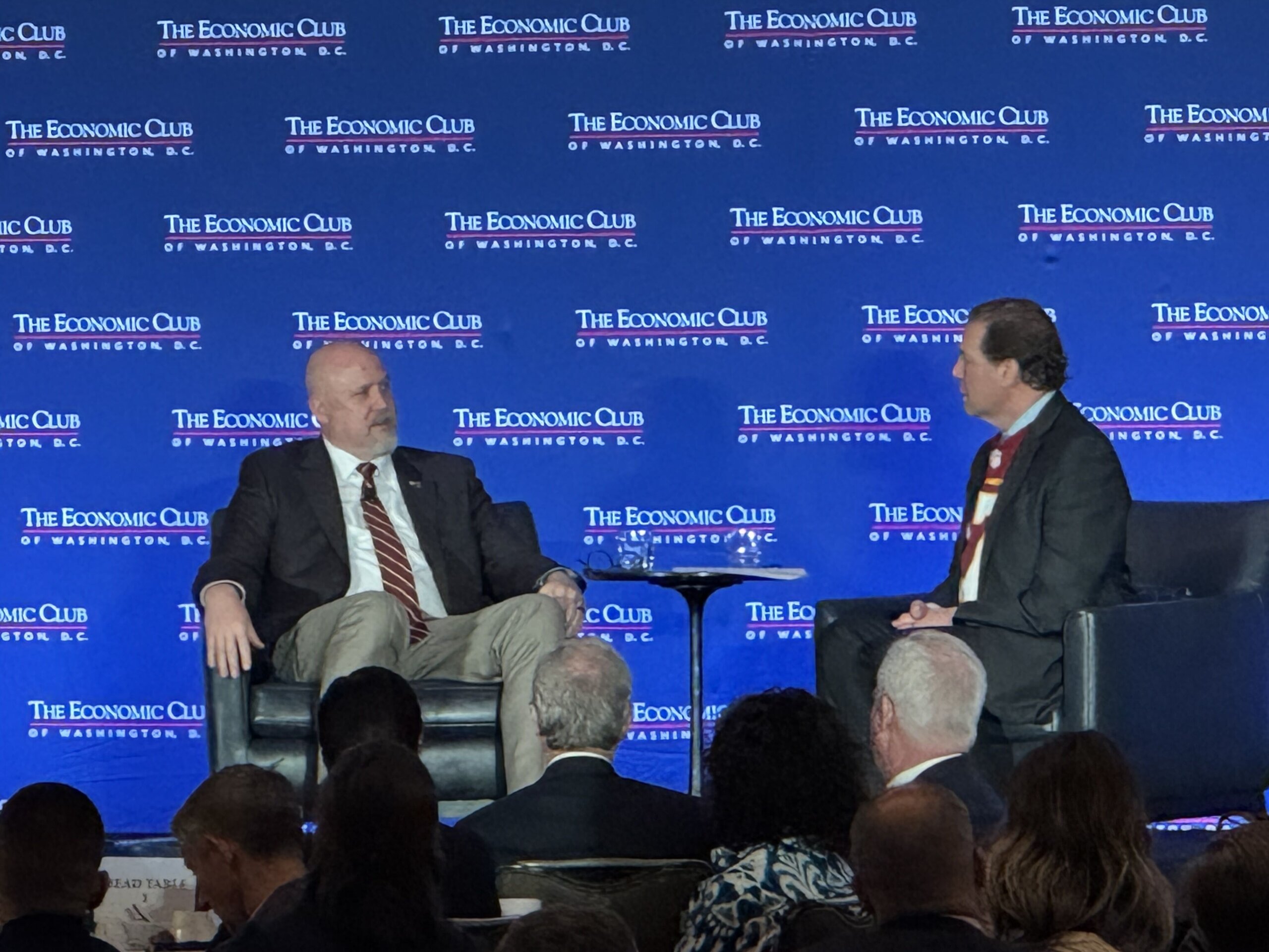 Mark Clouse (left) and Economic Club of Washington, D.C. Board Officer, Lawrence Di Rita speak at a live event on Monday, May 19. (WTOP/Mike Murillo)