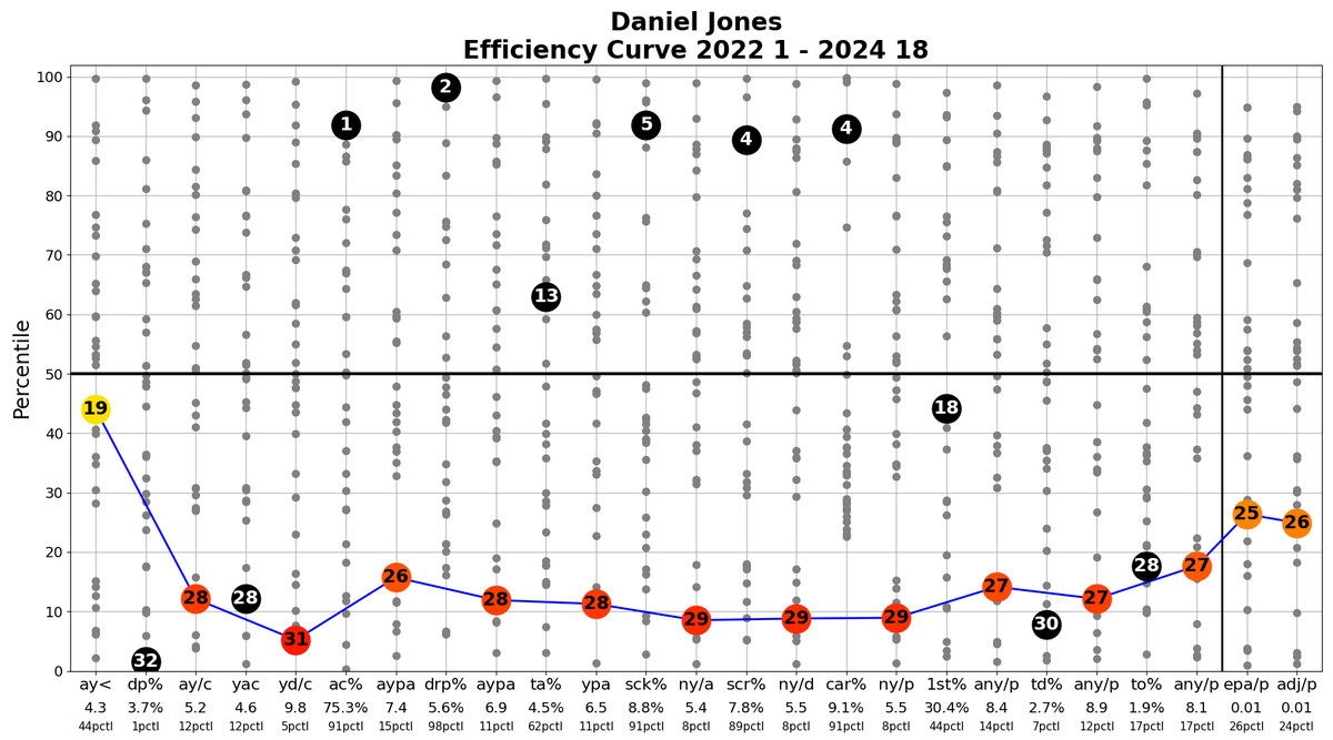 Although Jones ends up in roughly the same spot as Richardson, he gets there by a very different path. He’s much better in terms of accuracy, moving the chains, and ball security. However, he’s worse at generating explosive plays, scoring touchdowns, and he takes far too many sacks for being as mobile as he is.