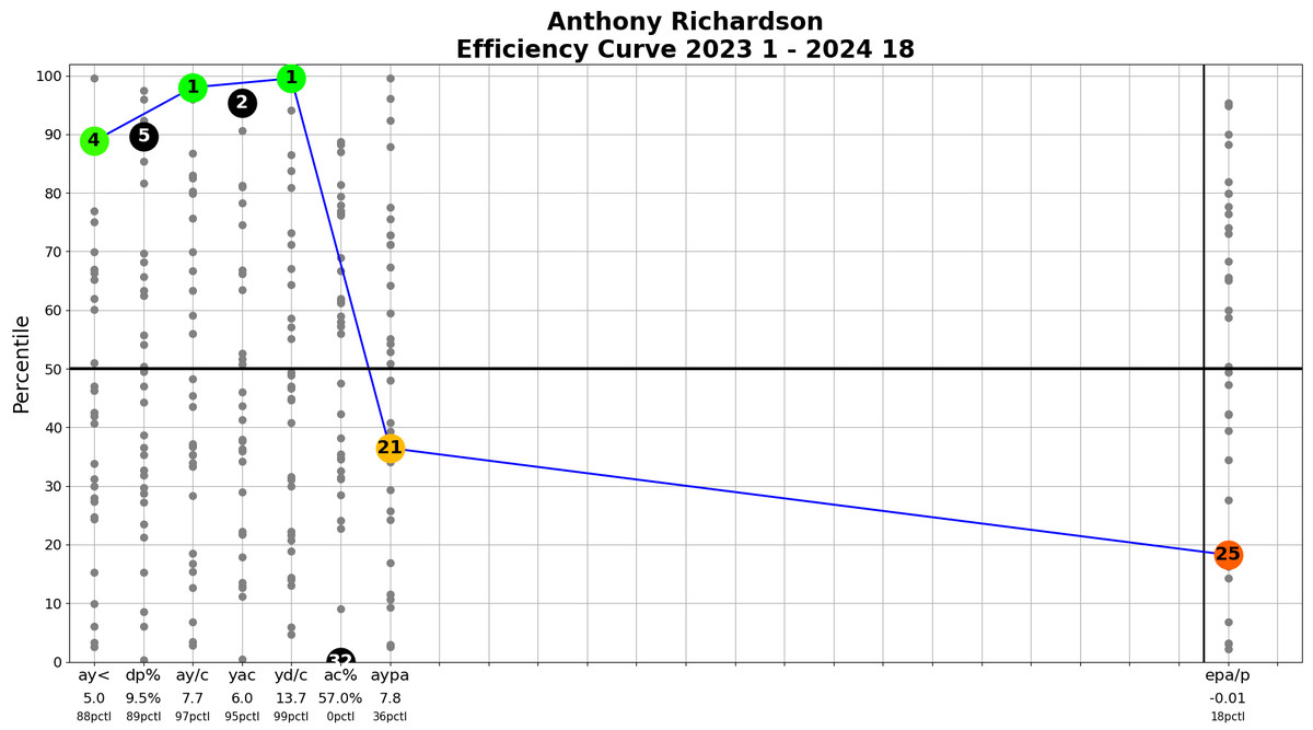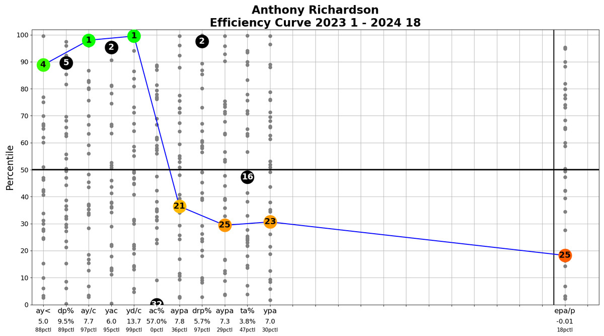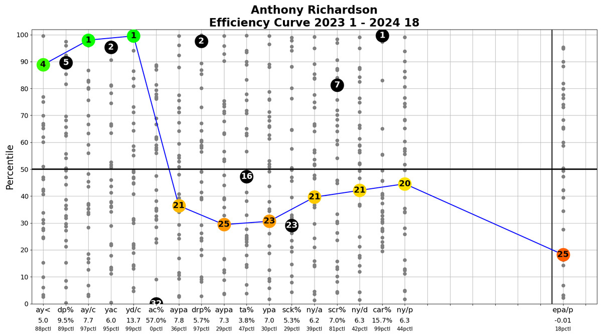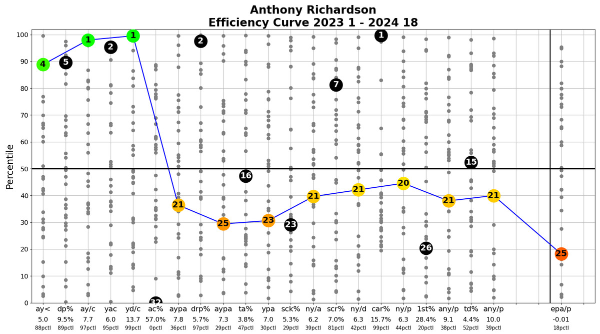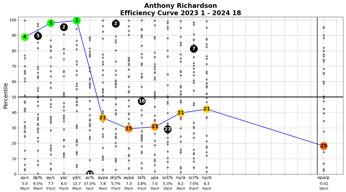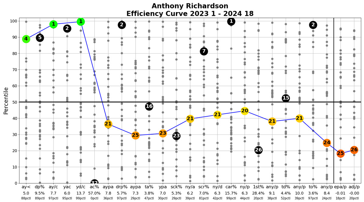 The efficiency curve highlights Richardson’s key weaknesses: completions, getting first downs, and turnovers. At the same time, his strengths are just as clear: explosive passing ability, efficient running, and good decision making using scrambles and throwaways to avoid sacks.