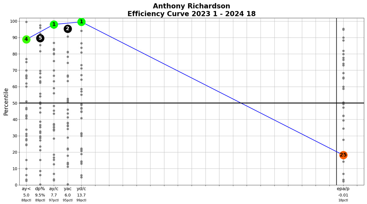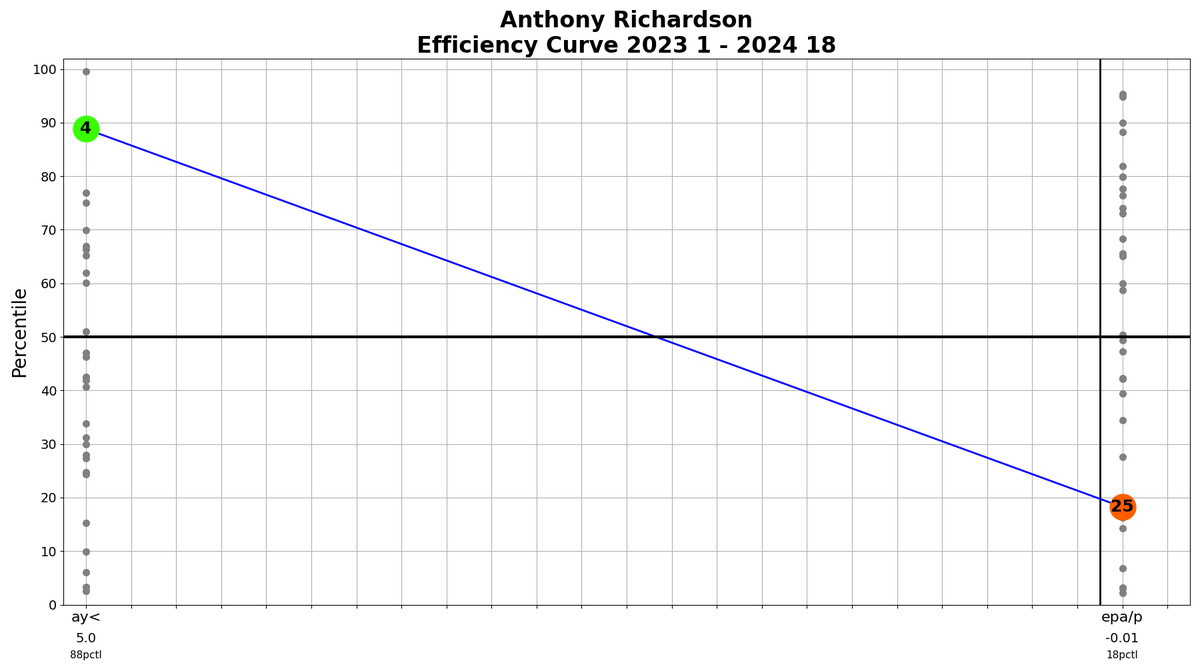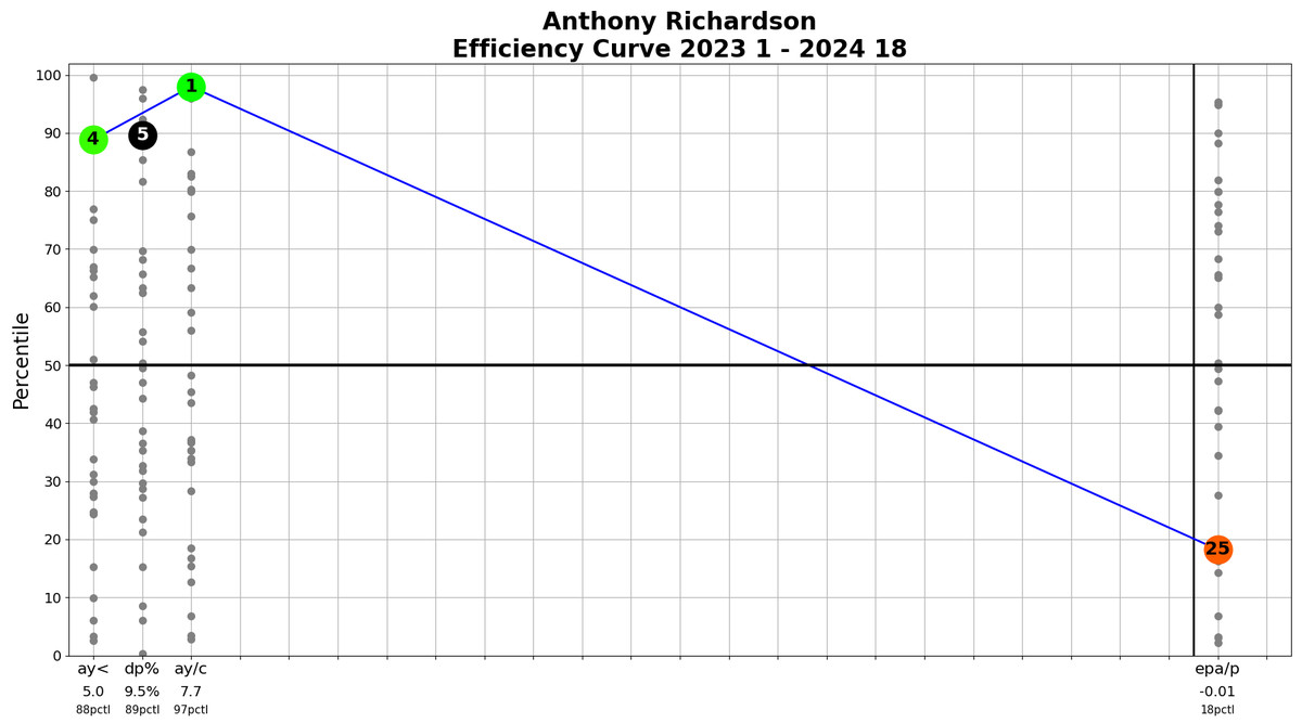 When I add in the impact of first downs, Richardson drops to 21st in adjusted net yards per play (any/p), and his roughly average touchdown rate does nothing to change that.