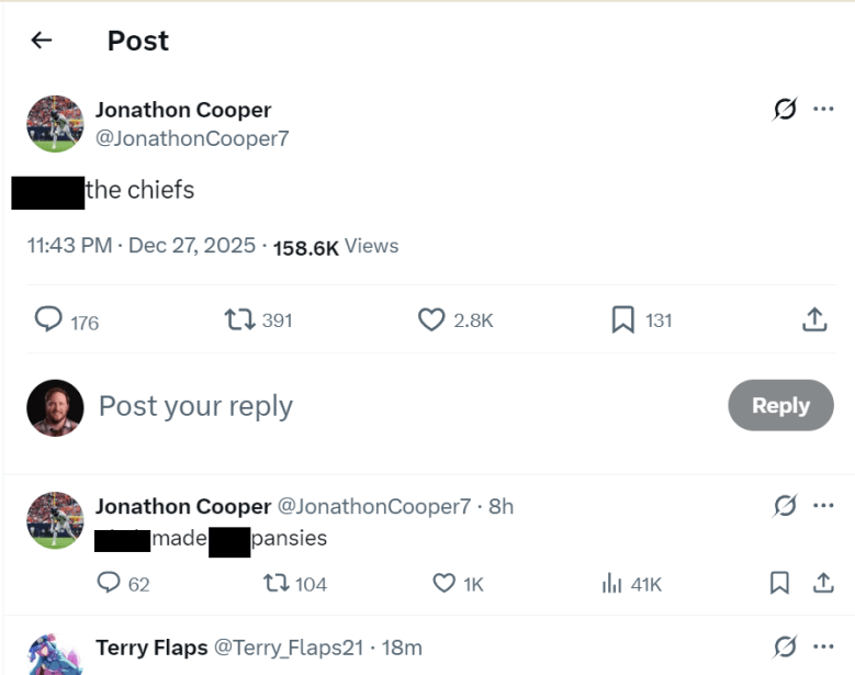 The post (and a follow-up reply) used profanity and a derogatory insult directed at Kansas City, language we’re not going to repeat here. In screenshots circulating online, the original post showed significant engagement and views shortly after it went up, a reminder that anything a starting-caliber NFL player posts can become a headline fast.