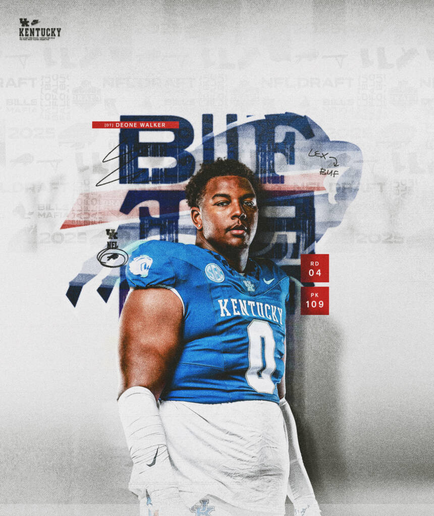 Kentucky junior defensive lineman Deone Walker was chosen in the fourth round by the Buffalo Bills as the 109th overall pick in the 2025 National Football League Draft on Saturday in Green Bay, Wisconsin. He joins UK teammates RB Ray Davis (2024 NFL Draft pick) and DB Maxwell Hairston (2025 NFL Draft pick) in Buffalo.