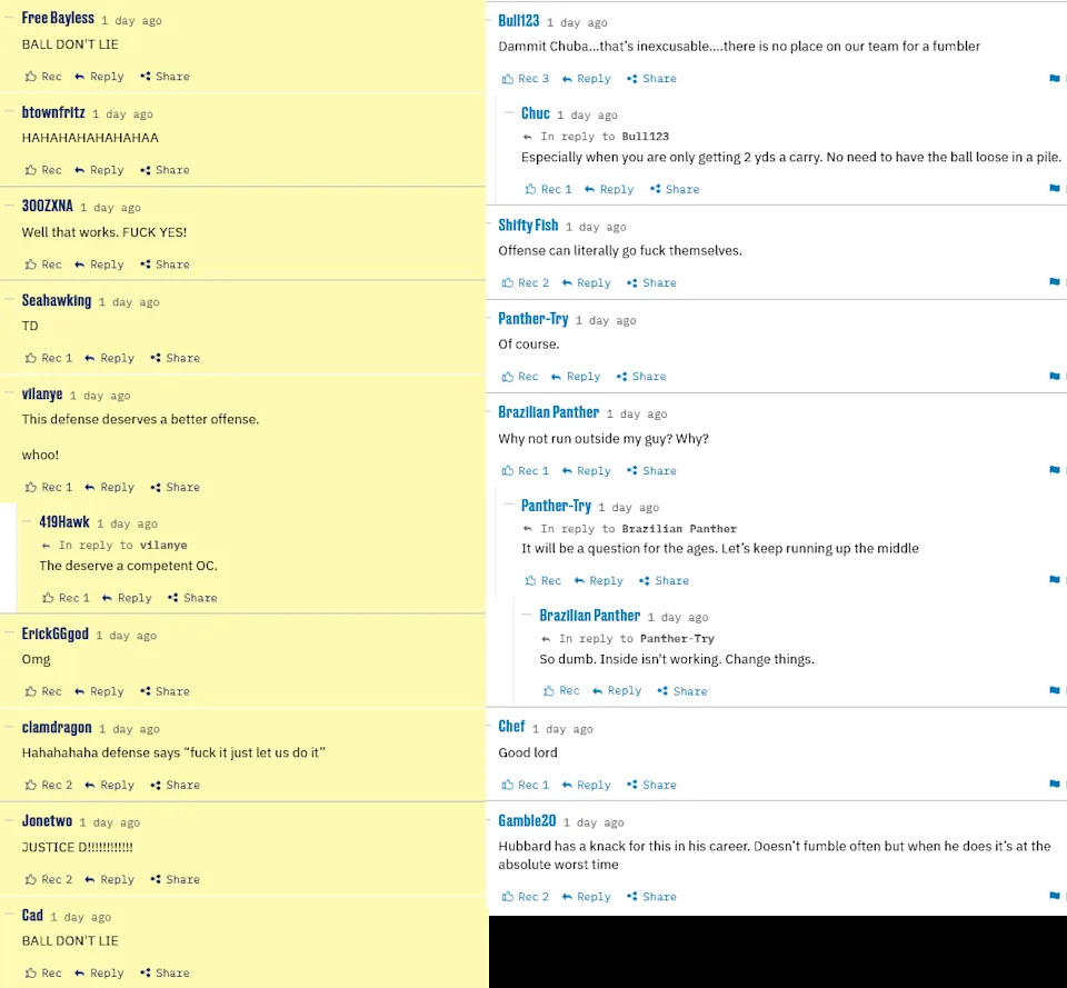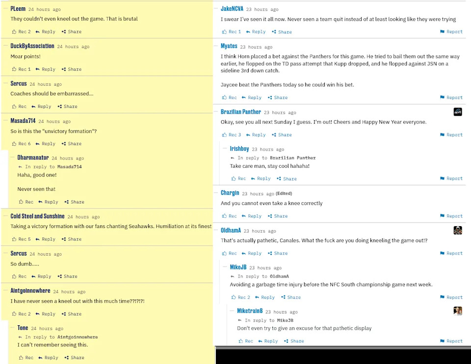 It’s time for Enemy Reaction for the Panthers, which we haven’t done in six years. Game thread comments are courtesy of Cat Scratch Reader, and having written this sentence before doing the screenshots, I’m curious to see how harsh they were on Bryce Young and the offense as a whole for this performance knowing they could’ve won the NFC South on Sunday.