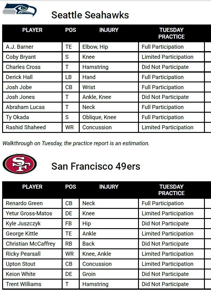 Here’s the full report for both teams, keeping in mind the 49ers also held a walkthrough: