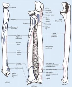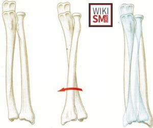 The forearm is the distal portion of the upper extremity between the wrist and the elbow. Two long bones, the radius and the ulna, run parallel between those two joints and are connected by a fibrous membrane. Based on the way the bones are connected, they allow for rotation of the forearm (pronation and supination):