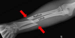A forearm fracture may involve the radius, the ulna, or both. A distal radius or ulnar fracture is often referred to as a wrist fracture when the broken portion is close to that joint, as with the injury that Aaron Rodgers had. A break in the middle portion of the bones in adults requires such a strong force that both bones are often involved. This was the case in 2014 for CB Ike Taylor, who sustained a fracture of both bones of his right forearm, resulting in obvious deformity.