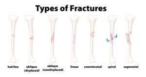 There are a variety of fracture types, defined by the orientation of the break to the bone as well as the number of fragments and the presence of displacement. While this schematic depicts a femur (thigh bone), it shows the range of common fracture types, as described on the Scientific Animations site: