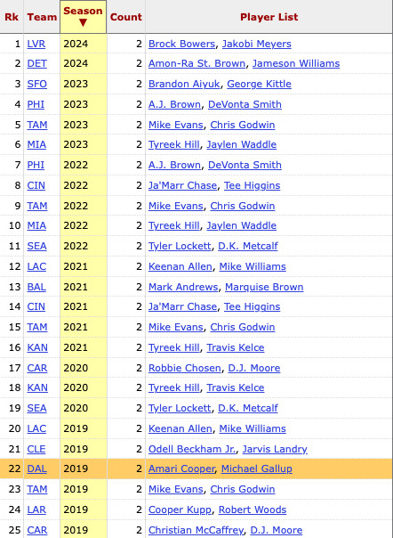 Jason Witten’s name appears here on four occasions which means that a wide receiver duo specifically has only done this three times in franchise history. By the way, it is remarkable how it was happening with such regularity throughout the Tony Romo era. He and Witten both remain perennially underrated.