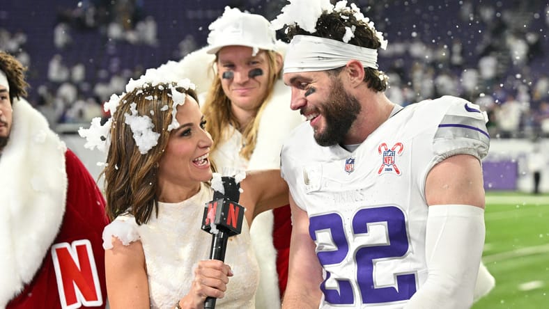 Dec 25, 2025; Minneapolis, Minnesota, USA; Minnesota Vikings safety Harrison Smith (22) is interviewed by Dianna Russini after the game against the Detroit Lions at U.S. Bank Stadium. Mandatory Credit: Jeffrey Becker-Imagn Images