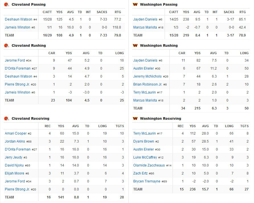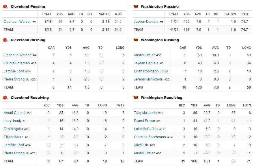 They fell to 0-6 when the Commanders defensive line got heavy pressure on Watson, sacking him for no gain. Cleveland punted, having earned just 2 first downs and gained just 42-yards of total offense with 06:48 left in the second quarter.