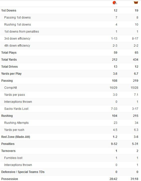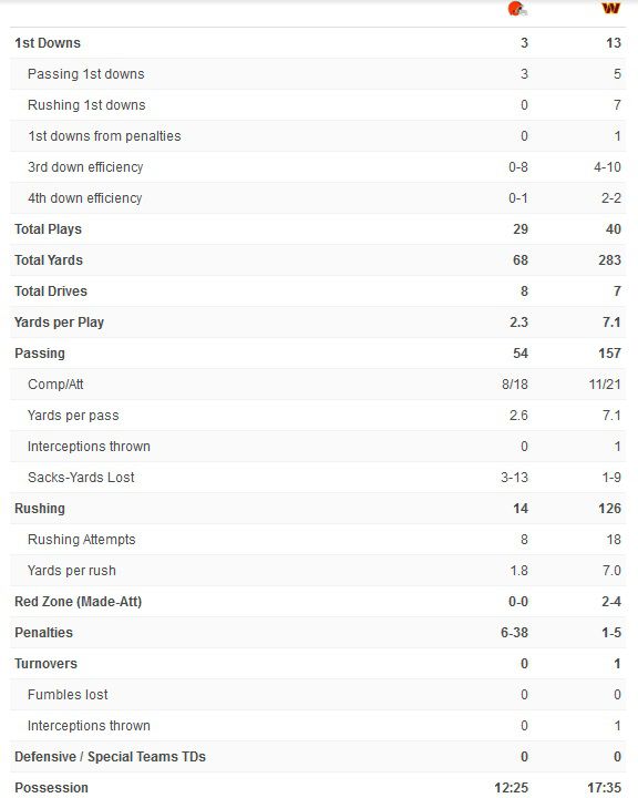 The Browns punted, and managed to down the ball at the Washington 2-yard line with about a minute left in the quarter.