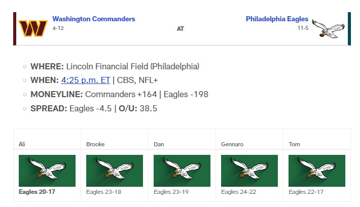 NFL Week 18 picks, predictions, schedule, odds, fantasy tipsCommanders (4-12) at Eagles (11-5)
