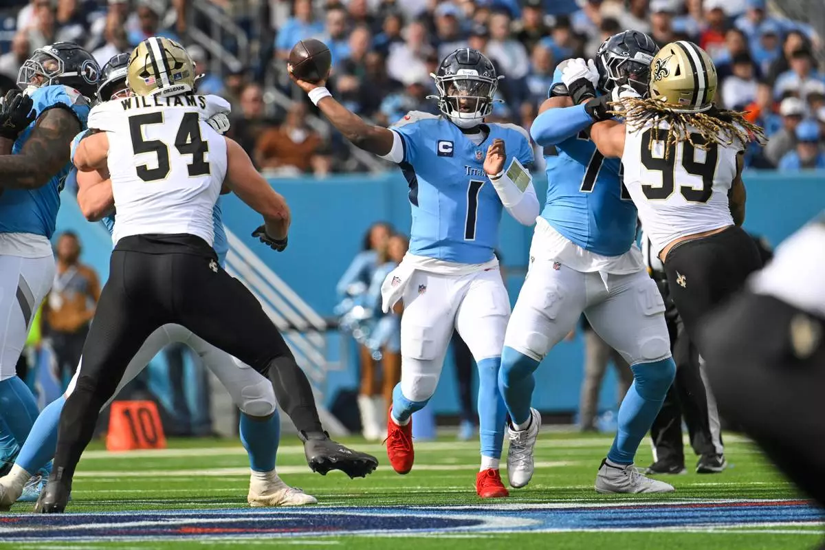 Tennessee Titans quarterback Cam Ward (1) passes against the New Orleans Saints in the first half of an NFL football game, Sunday, Dec. 28, 2025, in Nashville, Tenn. (AP Photo/John Amis)