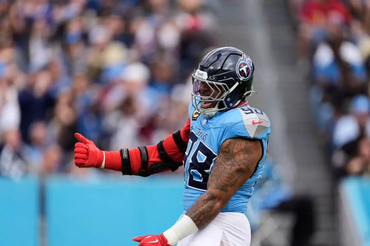 Tennessee Titans defensive tackle Jeffery Simmons (98) celebrates s sack against the New Orleans Saints in the first half of an NFL football game, Sunday, Dec. 28, 2025, in Nashville, Tenn. (AP Photo/George Walker IV)