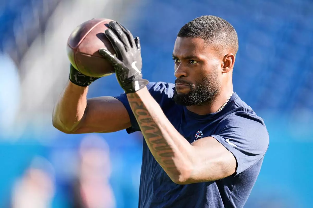 Tennessee Titans wide receiver Van Jefferson warms up before an NFL football game against the Kansas City Chiefs, Sunday, Dec. 21, 2025, in Nashville, Tenn. (AP Photo/George Walker IV)
