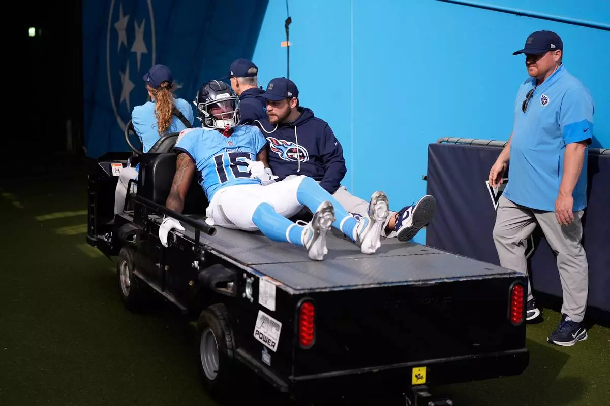 Tennessee Titans cornerback Jalyn Armour-Davis (18) is carted off the field after being injured in the first half of an NFL football game against the New Orleans Saints, Sunday, Dec. 28, 2025, in Nashville, Tenn. (AP Photo/George Walker IV)