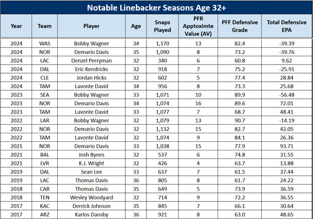 Notable examples like Demario Davis, Lavonte David, Bobby Wagner, and Thomas Davis all sustained high-level output well into their mid-30s—busting the myth that linebacker performance falls off a cliff at 30.