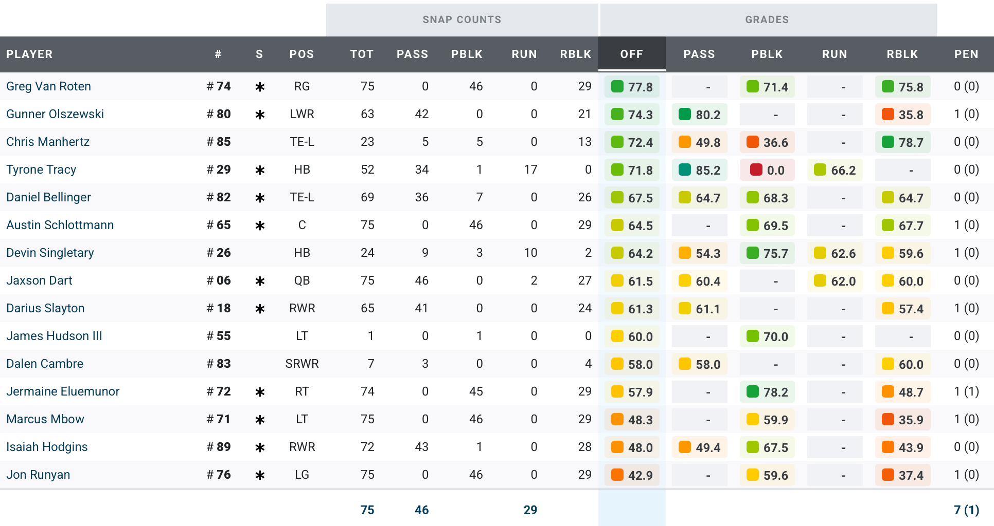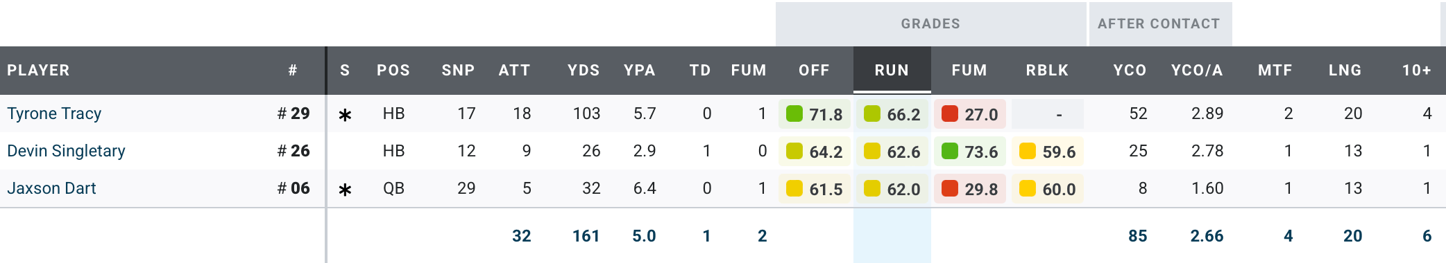 Tracy has really established himself as a viable part of a two-headed rushing attack with Cam Skattebo. Devin Singletary actually played well when called upon this year but is likely to be a cap casualty. Dart seems to have found the sweet spot between running recklessly and not running at all; yesterday he ran 5 times, 3 of them scrambles and 2 designed.