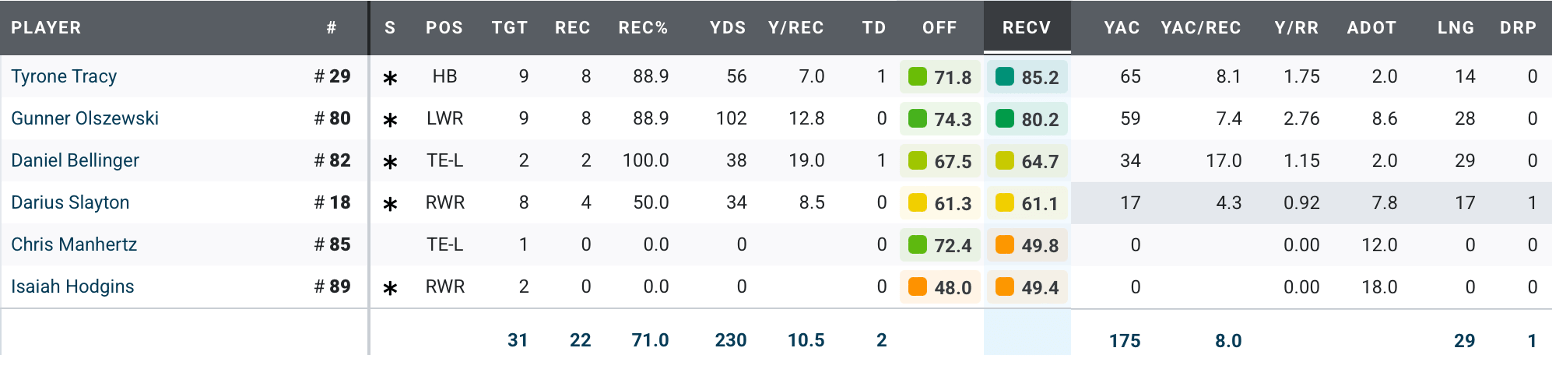 The chart above summarizes the dire state of the Giants’ receiving corps. The only two full-time wide receivers who played yesterday had 2 of the 3 lowest grades. Darius Slayton had a terrible year. He had chemistry with Daniel Jones and also with Tyrod Taylor; he hasn’t developed chemistry with Dart yet, although maybe that is because he was robbed of several explosive TDs by bad interference calls, including a 70-yarder yesterday. I am fully on board with the Giants using the No. 5 pick on Carnell Tate or Jordyn Tyson, and signing a significant free agent WR as well as bringing Wan’Dale Robinson back. Dart deserves a multiplicity of potential targets next season. That said, Tyrone Tracy really came on this season after becoming the starting RB, and receiving is definitely an important part of his game. And props to Gunner Olszewski, who has actually been involved in some of the Giants’ biggest pass plays of the season, on both ends.