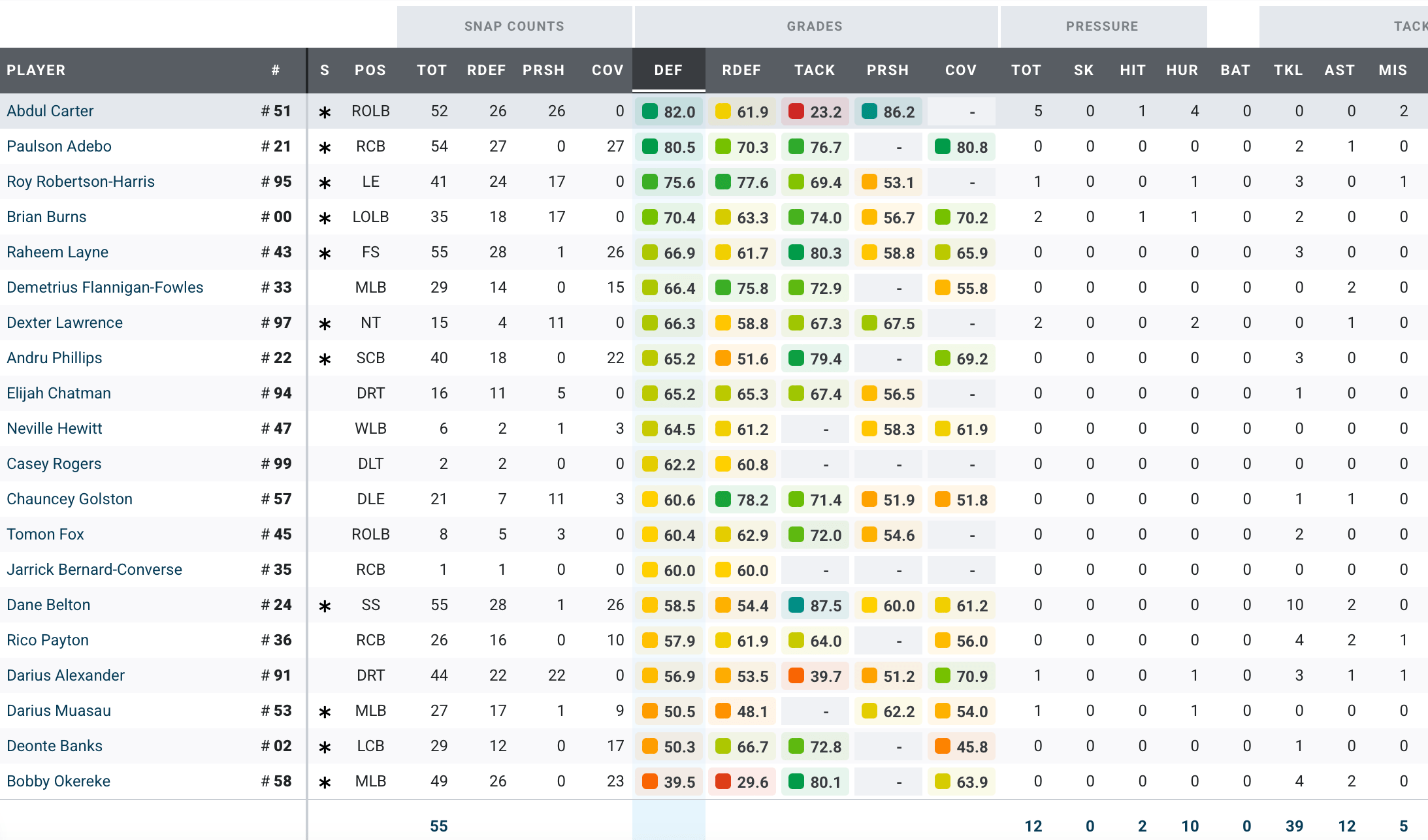 For a change, the Giants scored relatively well overall on run defense…although they did give up 143 yards. They only had two missed tackles on the day. Still, the worst performances were from the two starting linebackers, Bobby Okereke and Darius Muasau. Dru Phillips took a big step backward in run defense this season, as did Dexter Lawrence, who used to be one of the league’s best run defenders.