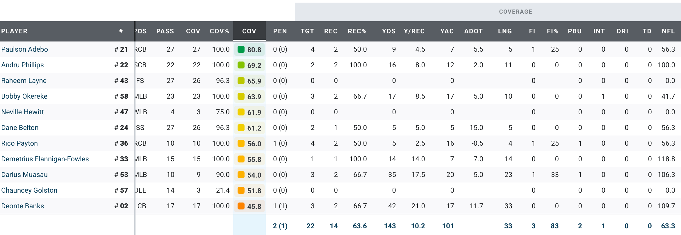 These numbers don’t mean much since Prescott, Lamb, and Pickens only played half the game. Paulson Adebo did have a good game, though, allowing only two short completions and having one forced incompletion. The Giants’ first-round kick returner, Deonte Banks, gave up 42 yards on 2 completions.
