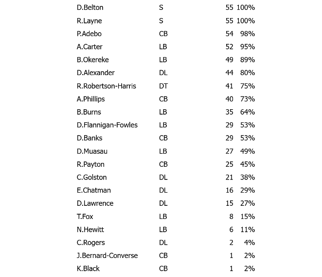 Safeties Dane Belton and Raheem Layne played the entire game.Paulson Adebo played almost every snap, Dru Phillips about 3/4 of the snaps, Deonte Banks about half the snaps, and Rico Payton almost half the snaps, with Jarrik Bernard-Converse and Korie Black making cameo appearances.Bobby Okereke played almost every snap, and the rest of the linebackers, in descending order of playing time, were Demetrius Flannigan-Fowles, Darius Muasau, and Neville Hewitt.Abdul Carter played almost every edge snap (remember how fans complained about his lack of PT in Week 1?), Brian Burns about 2/3 of snaps, Chauncey Golston a little less than half the snaps, and Tomon Fox a few snaps.Darius Alexander was on the field more than three-quarters of the time, Roy Robertson Harris exactly three-quartersof the time, and Elijah Chatman a bit less than one-third of the time, with Casey Rogers seeing 4 snaps as well. Dexter Lawrence had a season low (by far) 15 snaps.