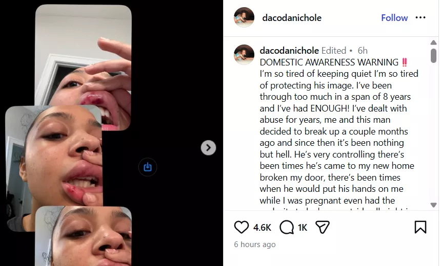 Along with the pictures, Dacoda Nichole shared a long note alleging a long-running pattern of physical and emotional abuse, intimidation, and controlling behaviour that she says continued even after their relationship ended. Dacoda shared that she was tired of being quiet and alleged that Rashee Rice had been abusing her for nearly 8 years. She added that they broke up a couple of months ago. However, her life has been hell ever since. The note read: