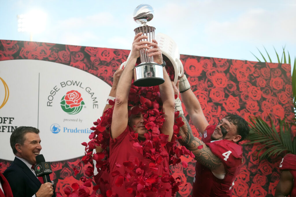 Jan 1, 2026; Pasadena, CA, USA; Indiana Hoosiers head coach Curt Cignetti celebrates with the trophy on the podium after defeating the Alabama Crimson Tide in the 2026 Rose Bowl and quarterfinal game of the College Football Playoff at Rose Bowl Stadium. Mandatory Credit: Kirby Lee-Imagn Images
