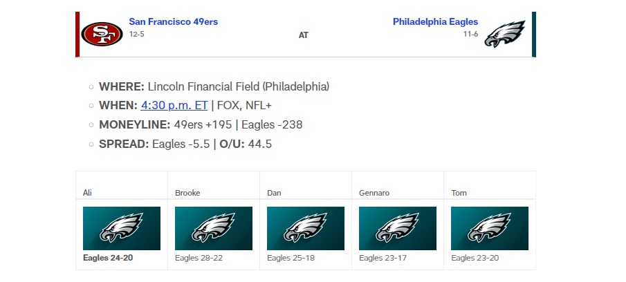 Why Tom picked the Eagles: Gennaro nailed it; this one is tough. In the end, I had to make a decision between what I want and what I think is right, which is really the dilemma at the heart of this cursed exercise every week. I wanted to pick the 49ers for a number of reasons, including Brock Purdy’s renewed swagger, Kyle Shanahan’s coaching acumen and, ultimately, because I just like them more. As far as defending champs go, the Eagles have been, let’s say, unconvincing. They’ve notched some recent solid wins against competitive teams, like low-scoring squeakers over the Bills (13-12 in Week 17), Lions (16-9 in Week 11) and Packers (10-7 in Week 10), and they’ve handled themselves against also-rans like the Commanders and Raiders, but there is exactly one victory over a fellow playoff contender in which they broke the 20-point mark: that wild 33-26 win over the Rams back in Week 3, which was, don’t forget, padded out by a freak return TD from a 336-pound nose tackle. Over the last nine games of the regular season, Philly ranked 22nd in the NFL in EPA per play on offense — that’s Panthers/Cardinals territory, folks. And much worse than the 49ers’ extremely appealing placement of third in the span, with Purdy returning from injury in Week 11. I don’t have much faith in the Eagles’ ability to move the ball, especially compared to the significantly livelier operation coming to town.