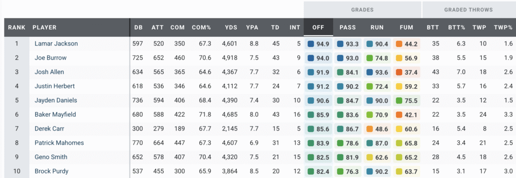 Daniels took the league by storm as a rookie, winning PFF’s Offensive Rookie of the Year. He posted a 90.6 overall grade (90.0 rushing, 84.7 passing) and led all quarterbacks with a 3.11 WAR. McLaurin remained a steady star and has a cumulative three-year WAR of 1.31, seventh-best among all receivers. Wagner added yet another elite run-defense season to his résumé, earning a 91.2 grade, his third straight year above 91.0.