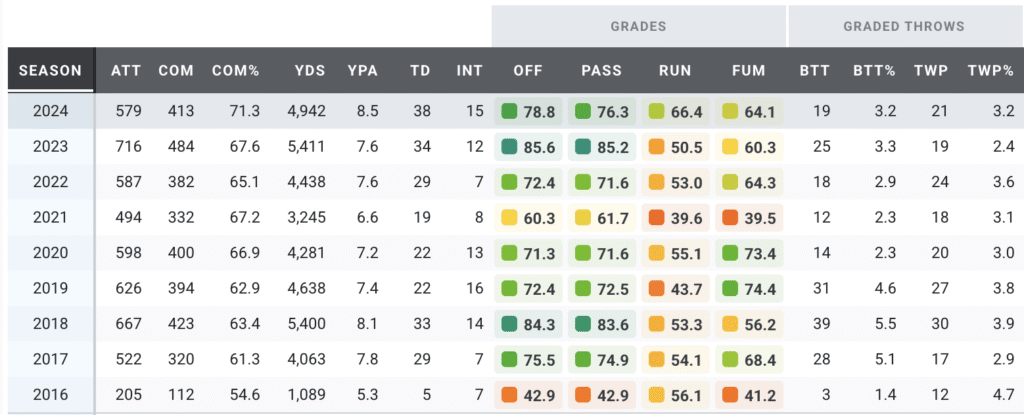 Parsons earned his fourth straight elite pass-rush grade in 2024 with a 91.6 mark, continuing to anchor Dallas’ defense. Lamb remained the offense’s top playmaker with a 90.8 receiving grade and a 27.8% target rate, topping 1,100 receiving yards. Prescott regressed slightly from his near-MVP 2023 season, with his big-time throw rate dipping to 4.5% and his turnover-worthy play rate rising to 4.7%. Even so, he’s still firmly among the Cowboys’ three best players.