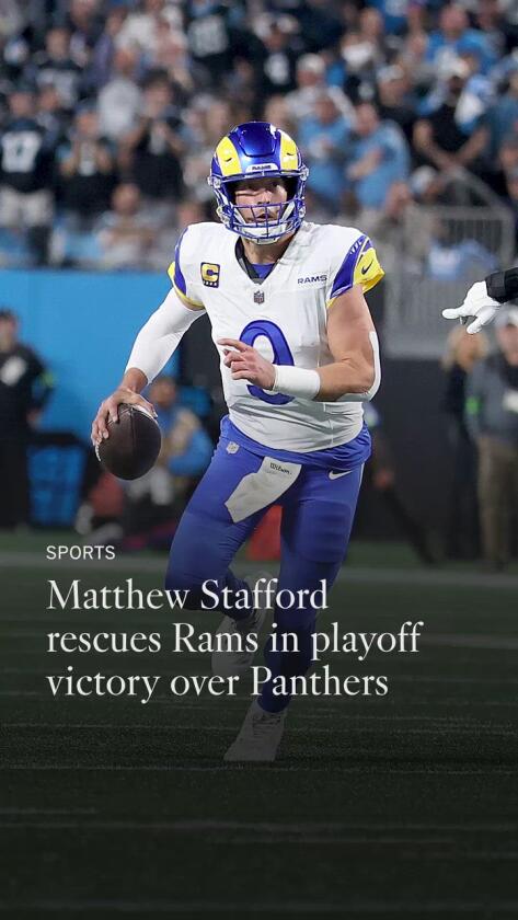 Rams quarterback Matthew Stafford walks off the field after a 34-31 playoff win over the Carolina Panthers on Saturday.