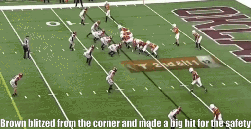 It has been rare for Brown to blitz, but he has made some plays over the years, with one NFL sack, some pressures and this safety in college.