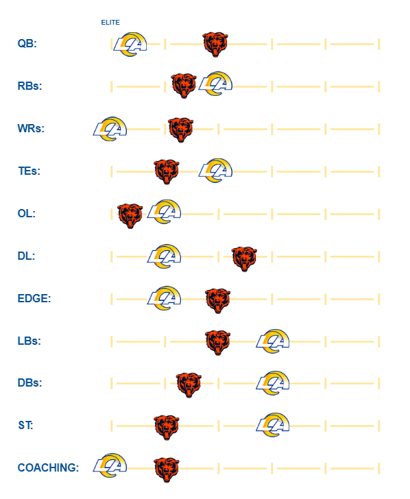 Coaching: Sean McVay and Ben Johnson are arguably the two best playcallers in football. This game should be offensive with both defenses giving up plenty of yards and touchdowns as of late. Chris Shula must stop the run to make Caleb Williams win this game with his arm (not his legs).