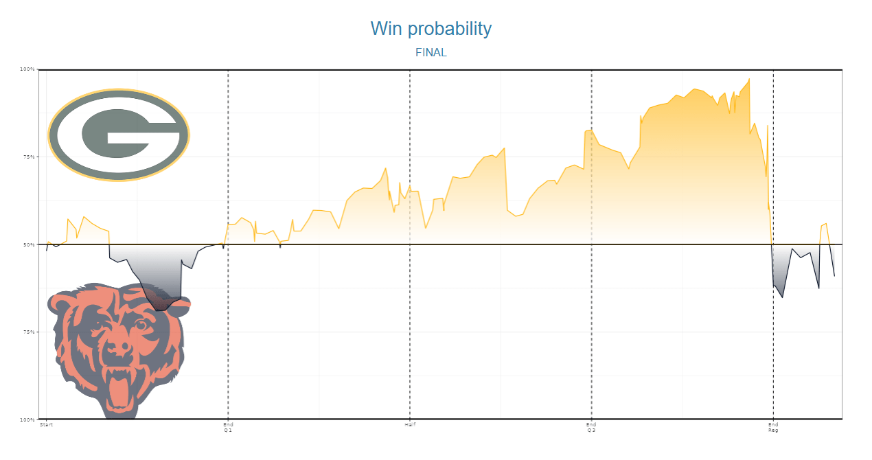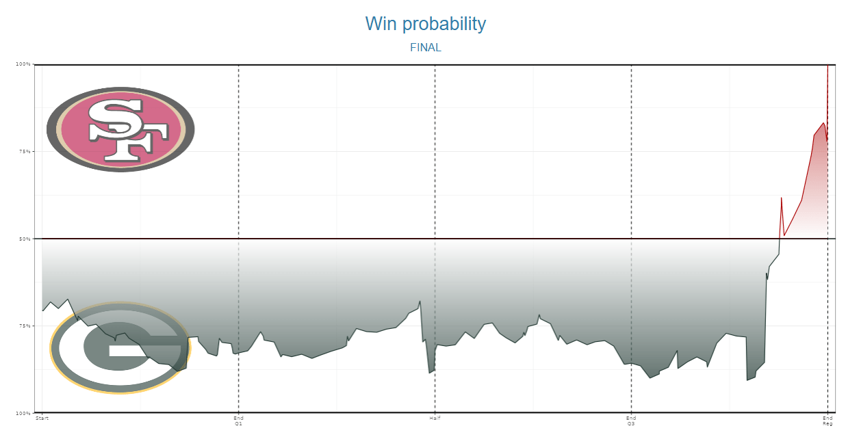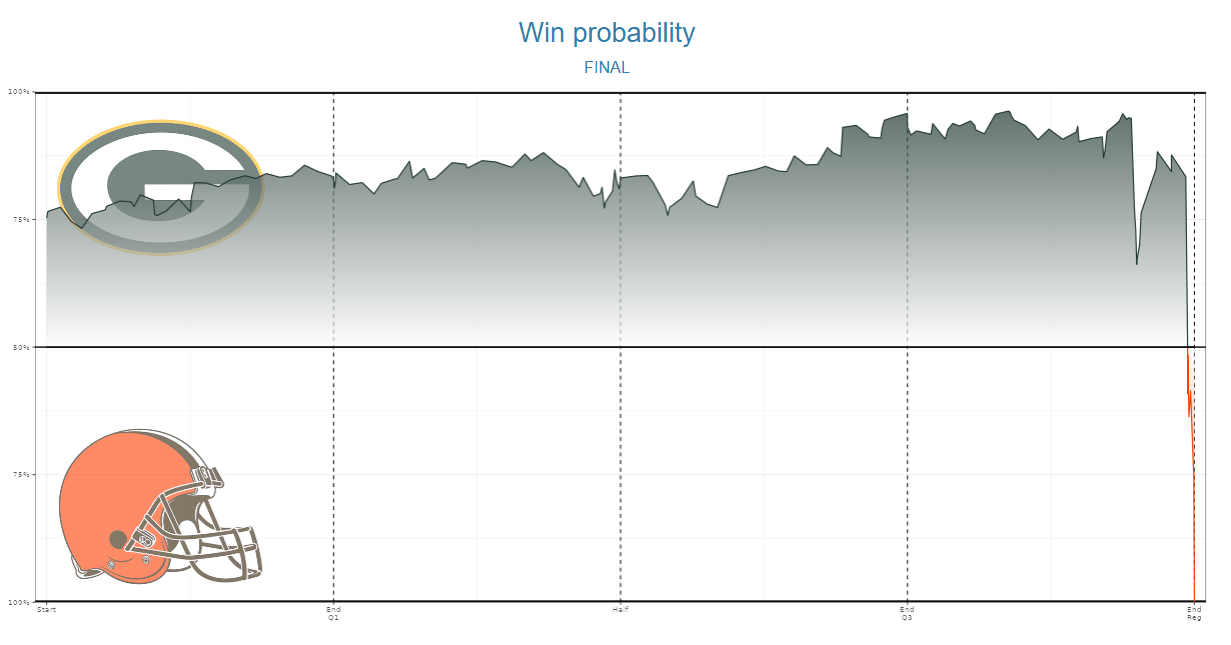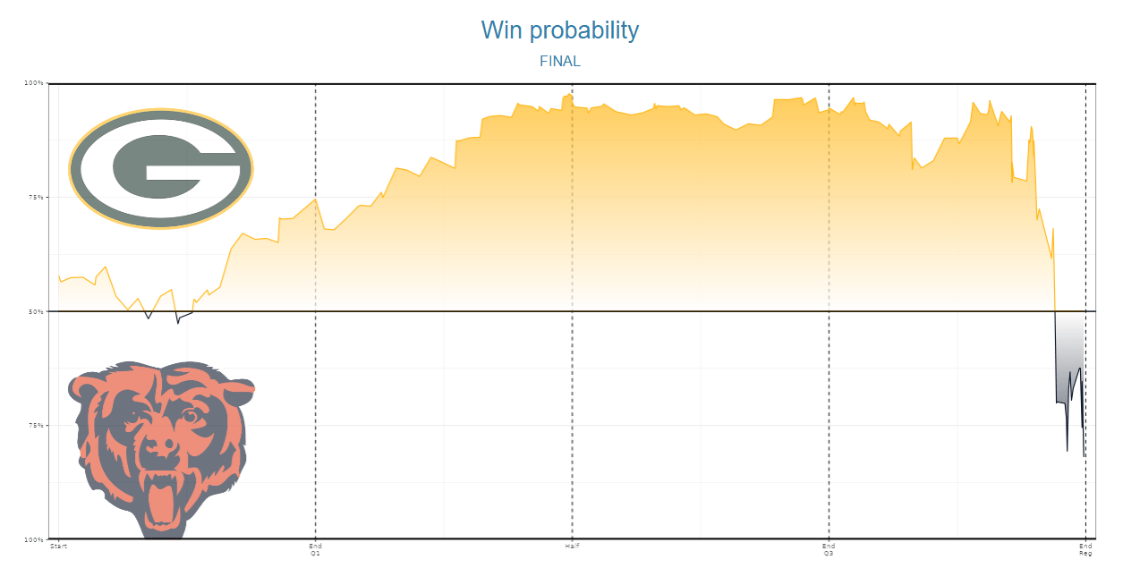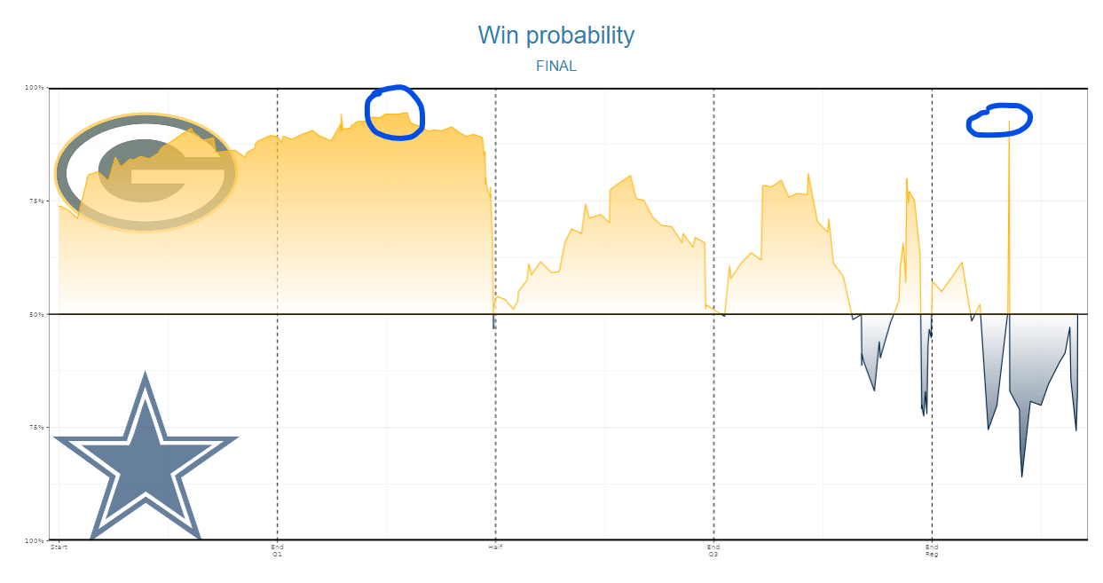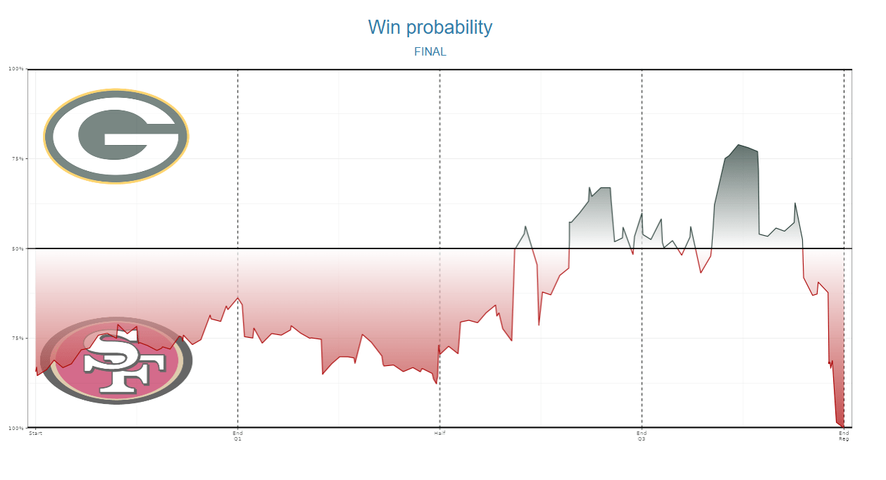 They’ve had some real collapses. And maybe that last one doesn’t seem quite as bad as the 49ers were ALSO above 75% to win it for much of the game, but the Packers rallied, and had the lead and the ball with six minutes to go in field goal range. Just six minutes from victory! And of course, it was conservative play calling and a missed Anders Carlson field goal that got them, because of course it was.