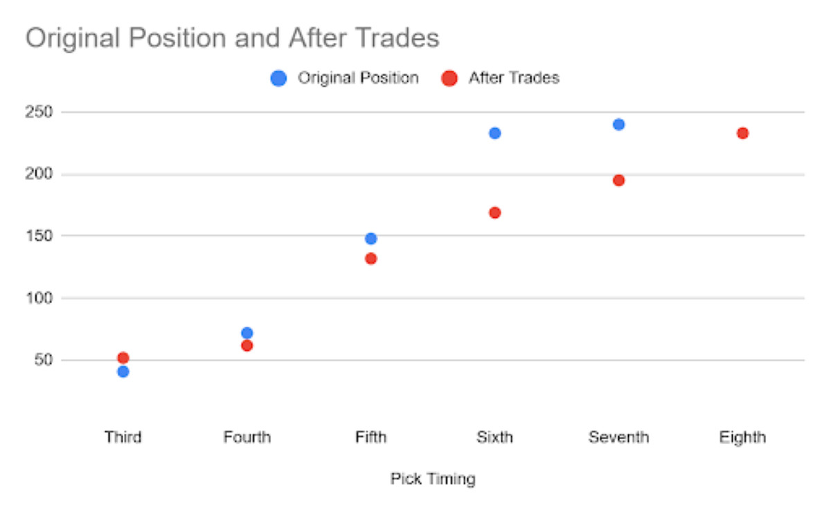 Multiple trades later, Poles had converted his last three picks (109, 148, and 233) into a linebacker, a corner, an interior offensive lineman, and (finally) a running back—in addition to a future pick as well. In the course of calculating all of his maneuvering in terms of “trade value”, I realized that the chart was simply the wrong way of looking at it, because it blinded me to the masterclass Poles had put on. It’s important to look at this draft in terms of the timing of each of Chicago’s picks in order compared to where they were originally located and where they were located after all of the trades he performed.