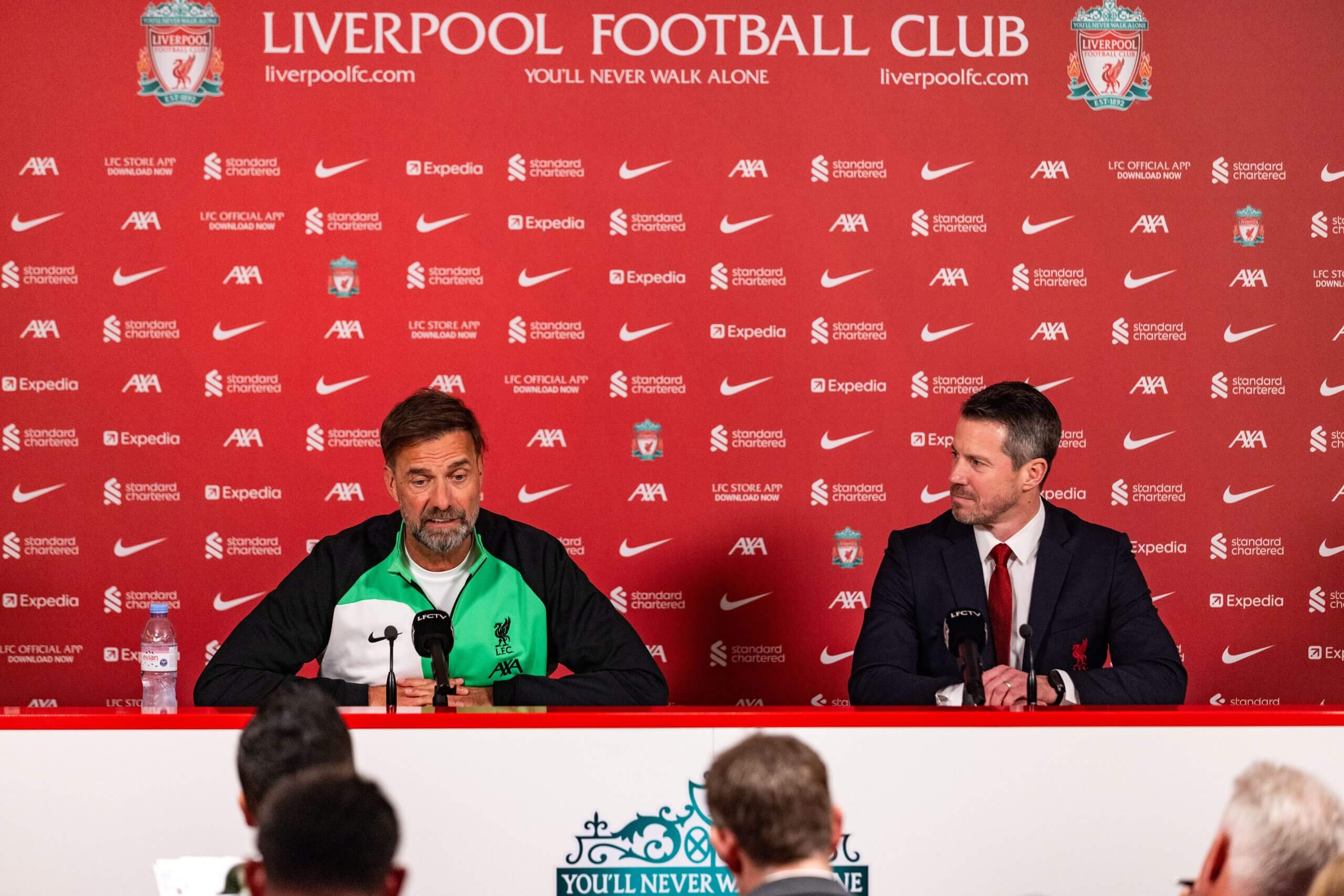 Klopp with CEO Billy Hogan during the announcement (Photo: Nikki Dyer – LFC/Liverpool FC via Getty Images)