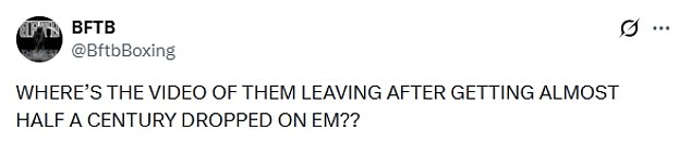‘WHERE’S THE VIDEO OF THEM LEAVING AFTER GETTING ALMOST HALF A CENTURY DROPPED ON EM??,’ another asked.