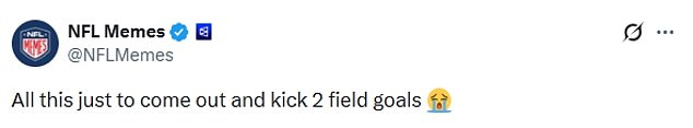 Taking to X, one fan shared the clip and wrote: ‘All this just to come out and kick 2 field goals’.