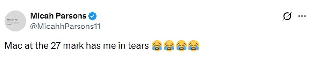Reacting to Jones’ cameo in the clip, Parsons wrote: ‘Mac at the 27 mark has me in tears [laughing emojis]’.