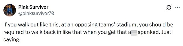 Another wrote: ‘If you walk out like this, at an opposing teams’ stadium, you should be required to walk back in like that when you get that a** spanked. Just saying.’